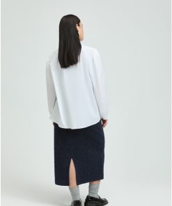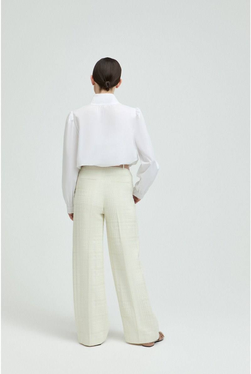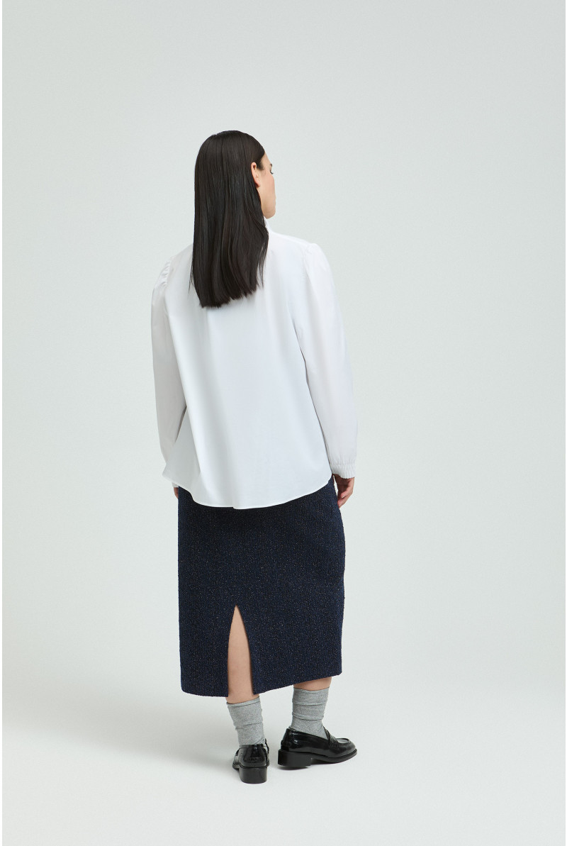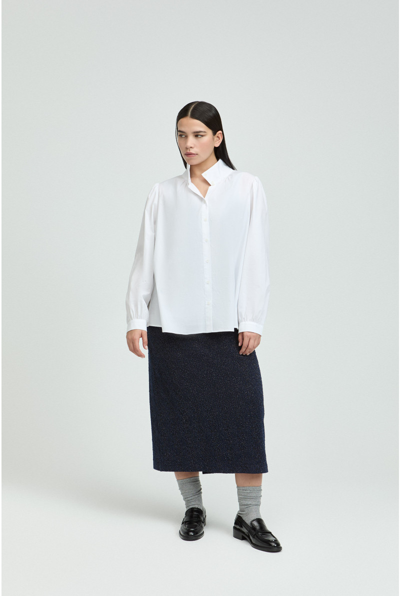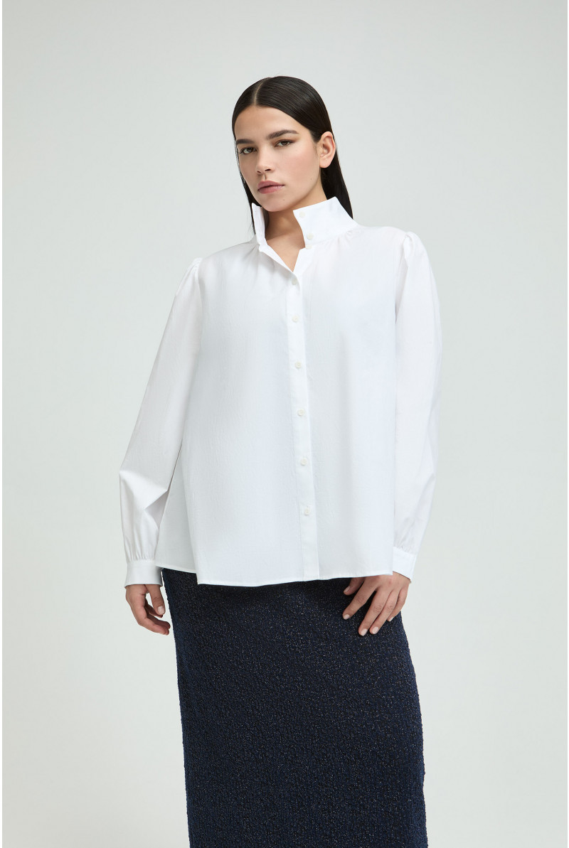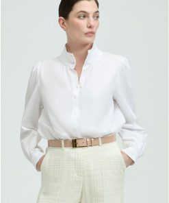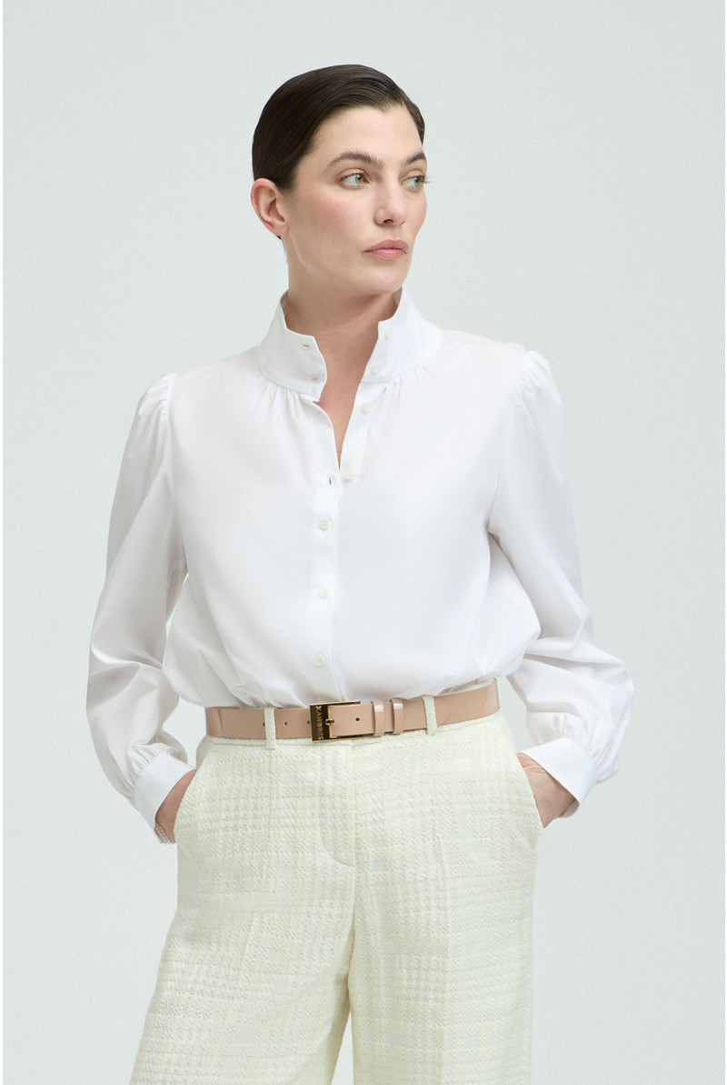 Een witte blouse vormt de basis van elke garderobe. De opstaande kraag en fronsjes aan de mouwen zorgen voor een moderne twist op de klassieke hemdblouse. Vervaardigd van 97% biologisch katoen.