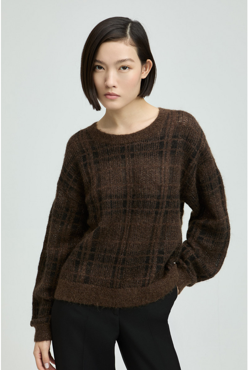 Deze zachte wollen trui is perfect voor de winter. Het ruitmotief, het gebruik van drie kleuren en de subtiele pailletten tillen jouw casual outfit naar een hoger niveau. Mooi te stylen met een modieuze jeans.